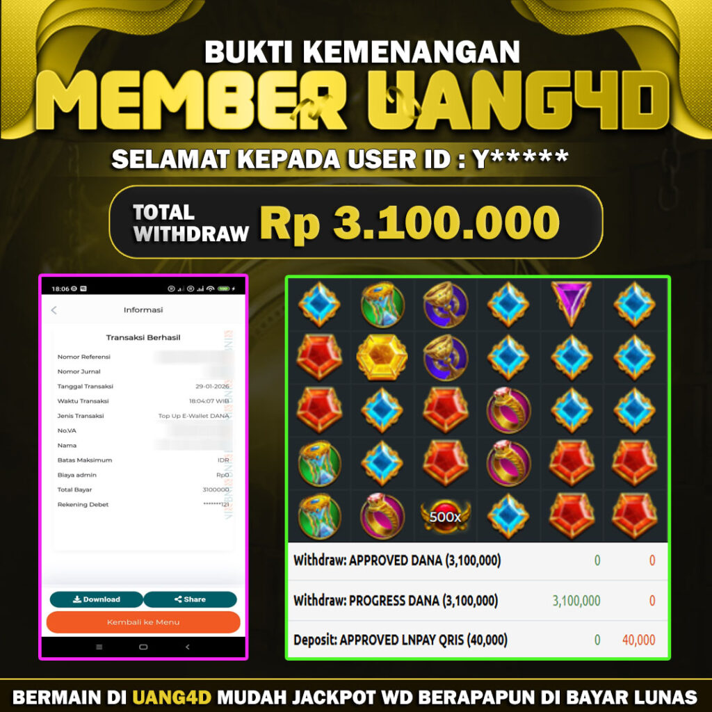 UANG4D dikenal sebagai situs terpercaya yang selalu menghadirkan pengalaman bermain slot online yang aman, fair, dan berlisensi resmi. Di sini, kami tidak hanya sekadar memberikan janji, tapi bukti nyata berupa slip kemenangan yang dapat Anda lihat secara langsung.