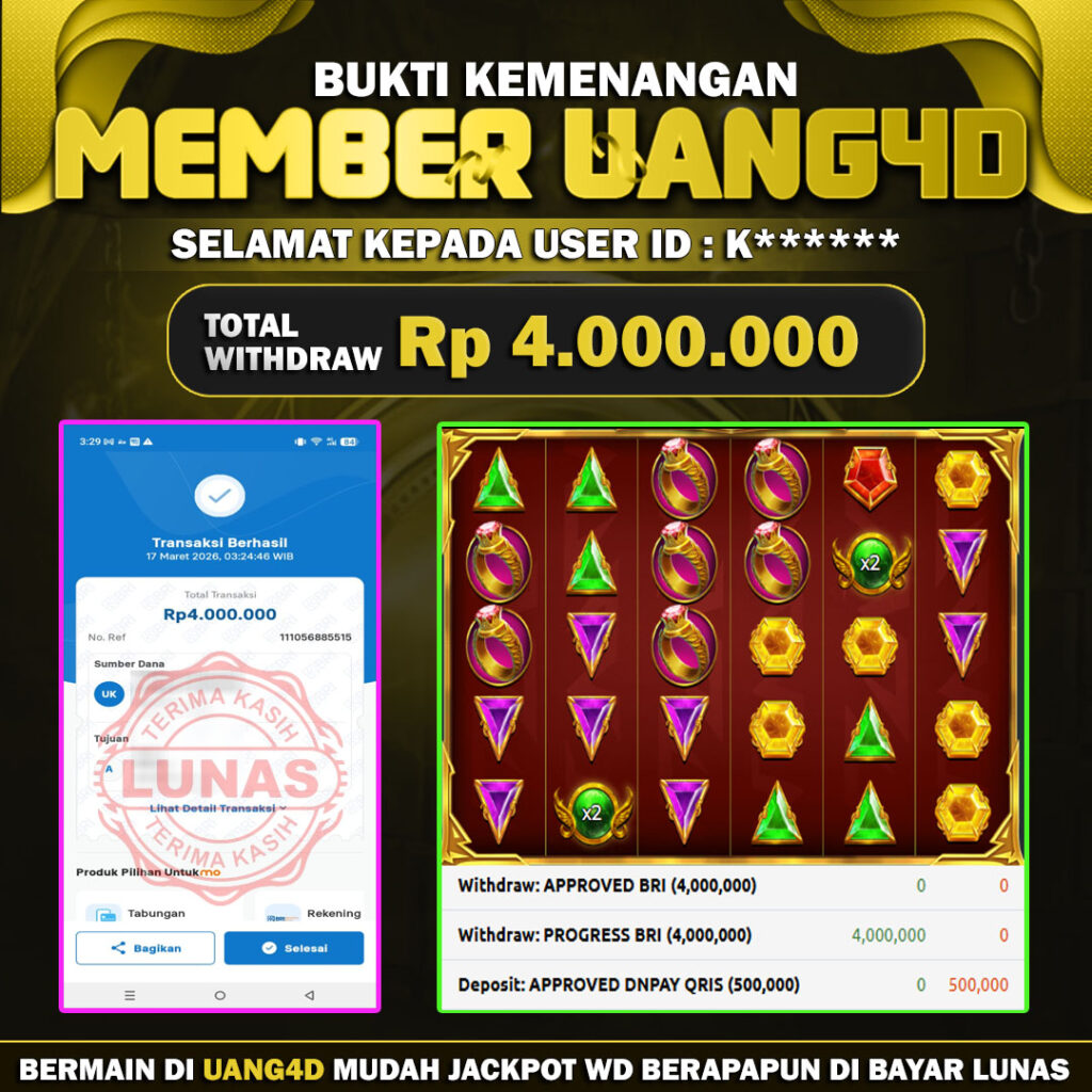 UANG4D dikenal sebagai situs terpercaya yang selalu menghadirkan pengalaman bermain slot online yang aman, fair, dan berlisensi resmi. Di sini, kami tidak hanya sekadar memberikan janji, tapi bukti nyata berupa slip kemenangan yang dapat Anda lihat secara langsung.