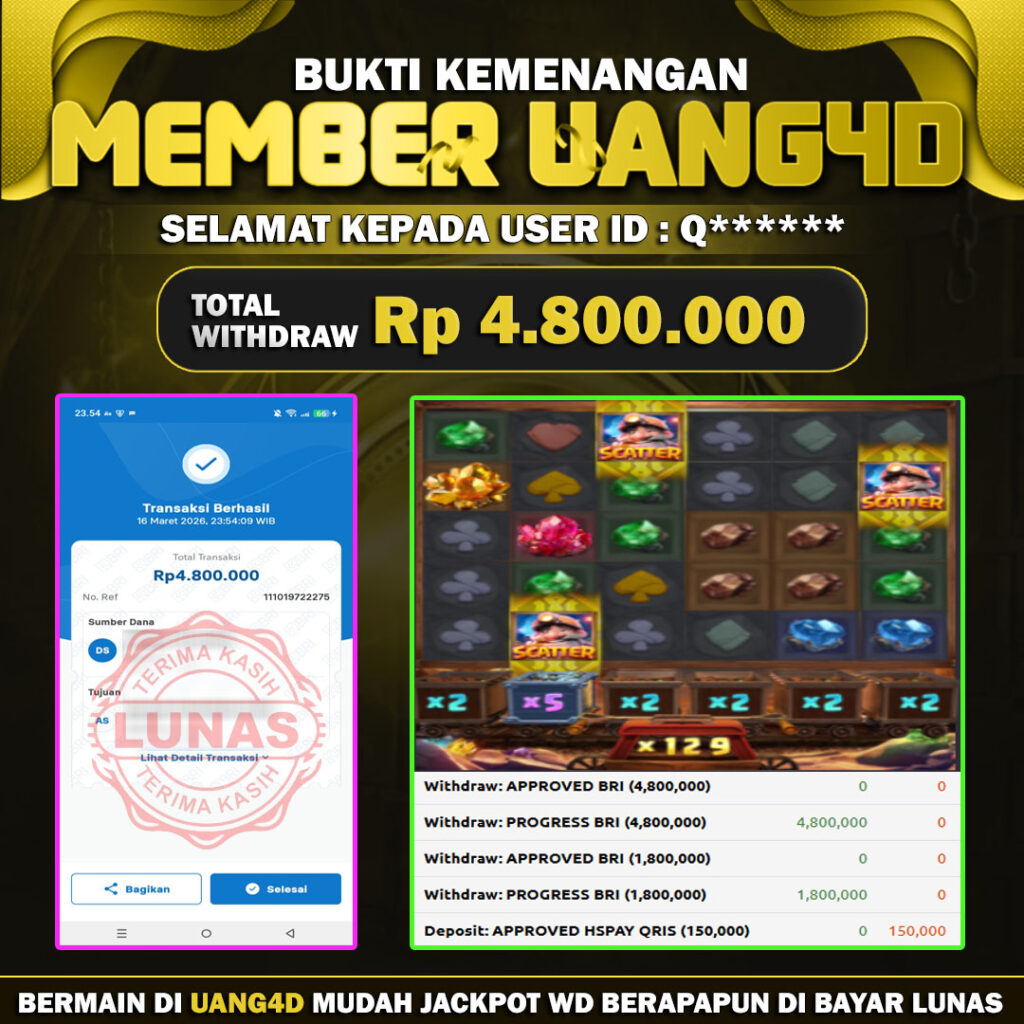 Jangan lewatkan kesempatan untuk meraih kemenangan besar. Daftar sekarang di UANG4D dan rasakan pengalaman bermain slot terbaik yang pernah ada! Putar gulungan, menangkan jackpot, dan jadilah bagian dari komunitas pemain sukses kami!