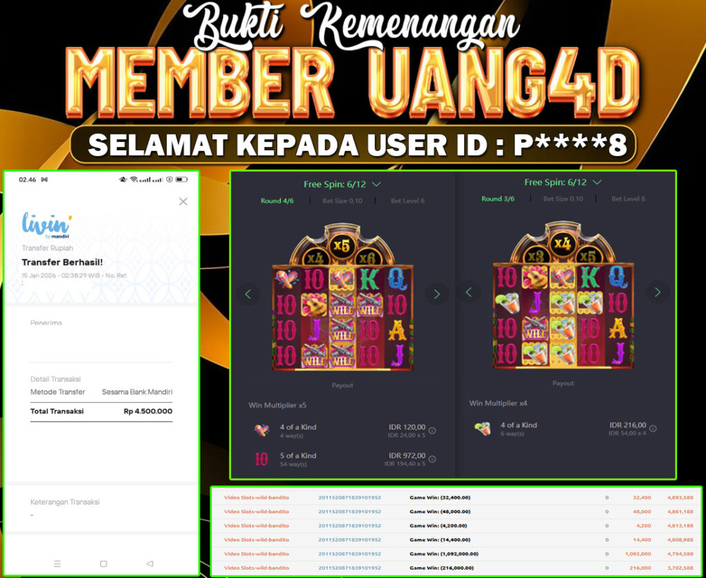 UANG4D –JACKPOT SLOT Wild-Bandito 15 JANUARI 2026, Kemenangan Slot, Bukti Kemenangan Slot, Kemenangan Slot Pragmatic Play, Menang Slot online, Slot Gacor, Situs Aman Terpercaya, Withdraw Berapapun Pasti DI Bayar Tuntas, Maxwin Slot Online.