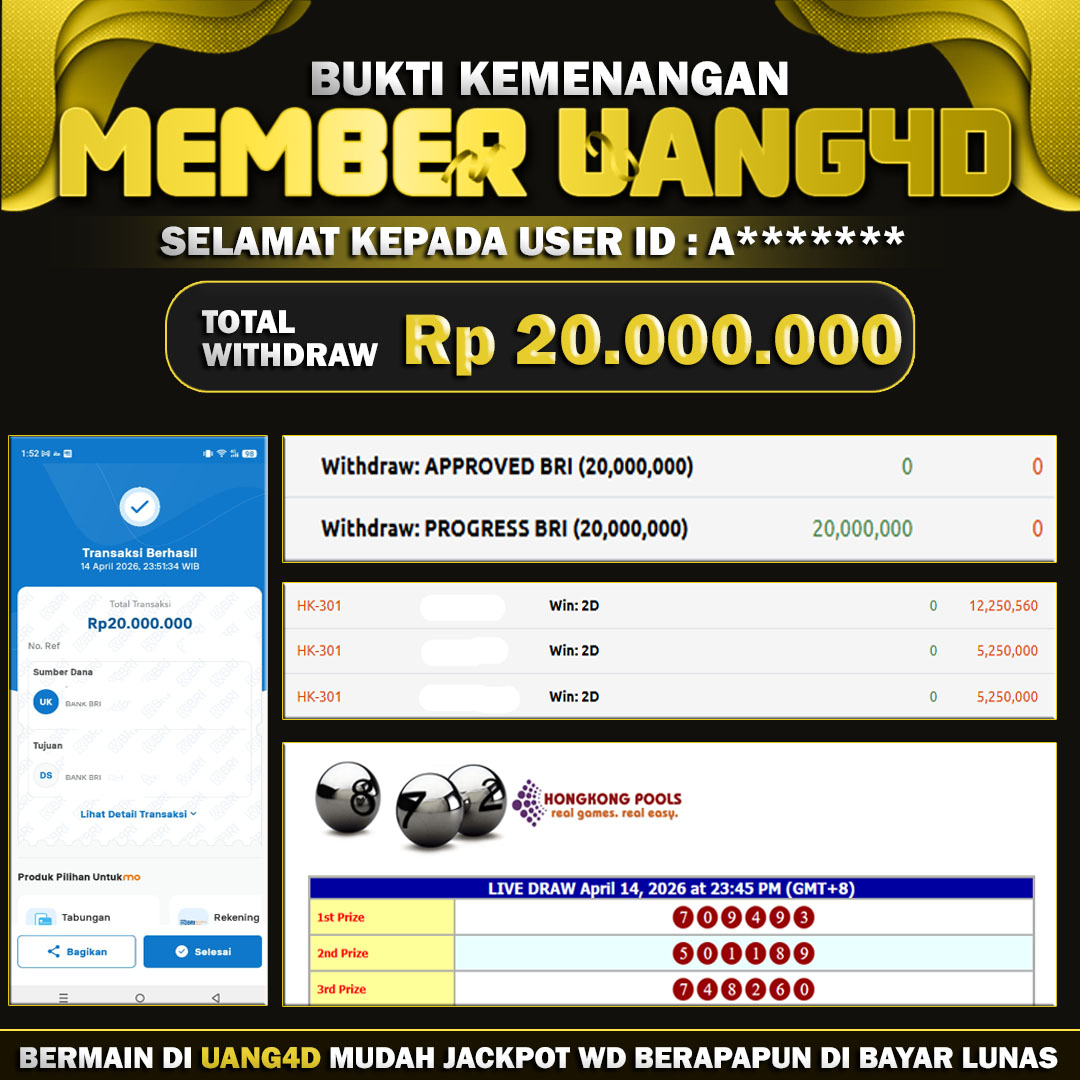 Setiap hari, member UANG4D berhasil meraih jackpot besar dari berbagai provider togel ternama yang kami sediakan, seperti Sydney, Singapore, Hongkong dan masih banyak lagi. Kami secara rutin menampilkan bukti screenshot atau rekapan kemenangan yang berhasil diraih, mulai dari kemenangan ratusan ribu hingga puluhan juta rupiah. Semua slip kemenangan ini kami hadirkan untuk membuktikan bahwa di UANG4D, peluang menang itu nyata.