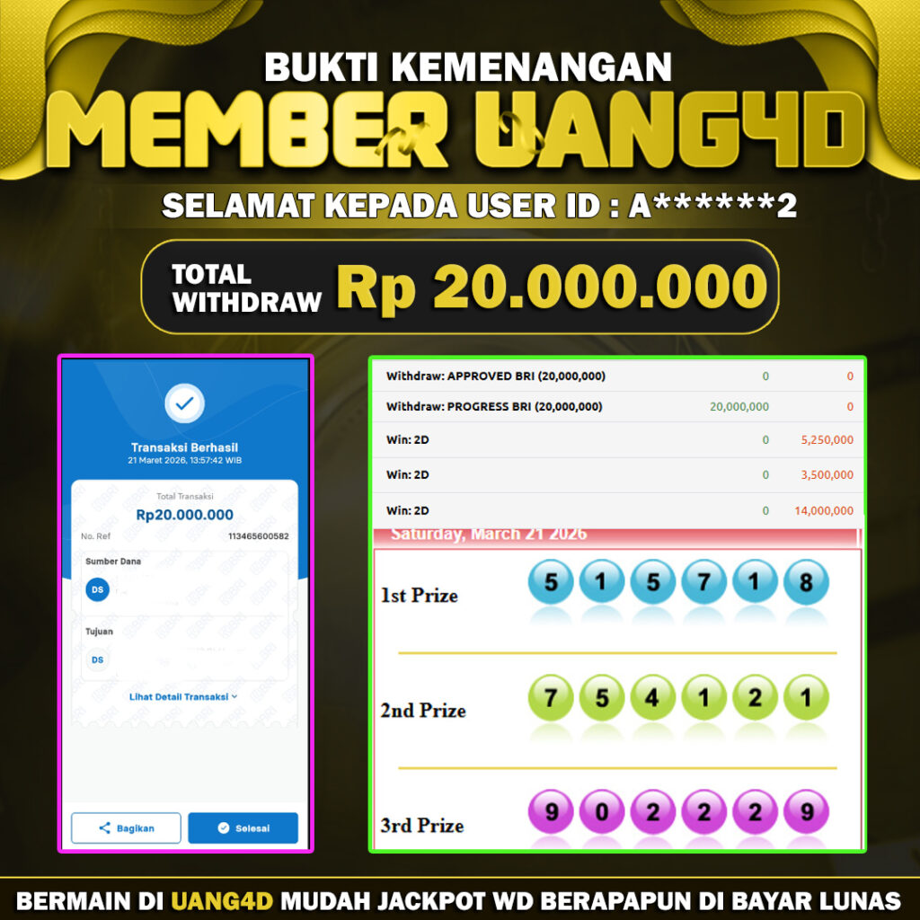 Setiap hari, member UANG4D berhasil meraih jackpot besar dari berbagai provider togel ternama yang kami sediakan, seperti Sydney, Singapore, Hongkong dan masih banyak lagi. Kami secara rutin menampilkan bukti screenshot atau rekapan kemenangan yang berhasil diraih, mulai dari kemenangan ratusan ribu hingga puluhan juta rupiah. Semua slip kemenangan ini kami hadirkan untuk membuktikan bahwa di UANG4D, peluang menang itu nyata.